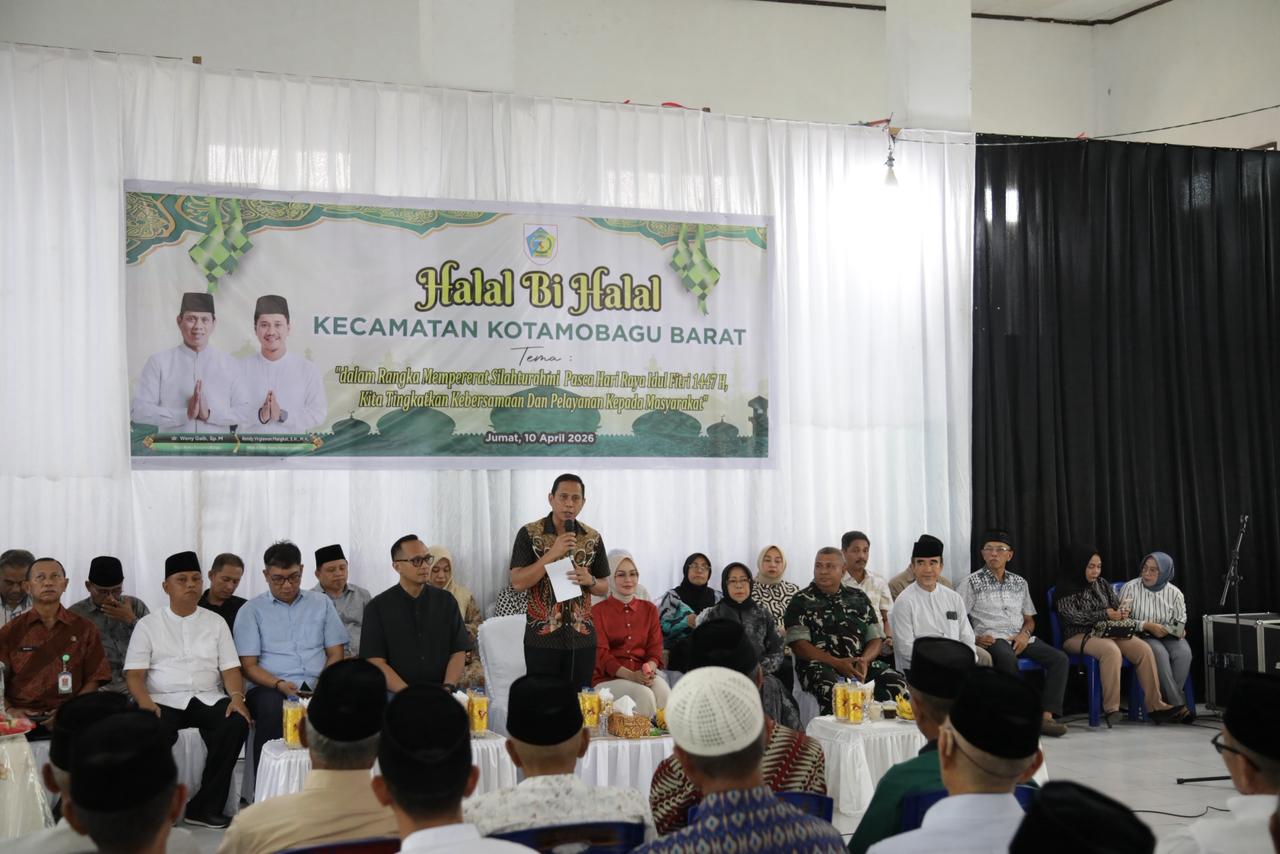 KOTAMOBAGU, SATUBMR.COM— Wali Kota Kotamobagu, dr. Weny Gaib, Sp.M, bersama Ketua TP PKK Kota Kotamobagu, Ny. Rindah Gaib Mokoginta, S.E., M.Ec.Dev, menghadiri kegiatan Halal Bi Halal bersama masyarakat Kecamatan Kotamobagu Barat yang dilaksanakan di Kelurahan Molinow, Jumat (10/4/2026)