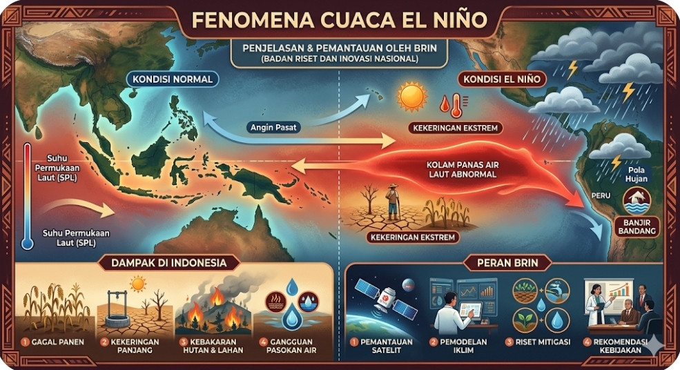 SATUBMR, Jakarta — Badan Riset dan Inovasi Nasional (BRIN) mengingatkan potensi terjadinya fenomena El Nino ekstrem yang kerap disebut sebagai “El Nino Godzilla”, yang dapat berdampak signifikan terhadap kondisi cuaca di Indonesia, Selasa 24 Maret 2026.